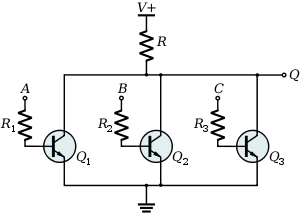 شماتیک یک دروازه چند ترانزیستوری RTL NOR که برای ساخت رایانه راهنمای آپولو استفاده شد[2]