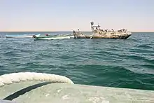 سد حدیثه، عراق، (۱۶ سپتامبر ۲۰۰۷) – یک قایق گشت رودخانهای با اسکادران رودخانهای ۱، گروه رودخانهای ۱، فرماندهی رزمی اعزامی نیروی دریایی، برای حمایت از تیم ۲ رزمی وابسته به هنگ در برای پشتیبانی از اجرای منع رفتوآمد ۲۴ ساعته جدید آبراه نزدیک به سد، چند قایق را به سمت رودخانههای مصادره شده میراند. نیروهای گشت رودخانهای قبل از توقیف قایقهای تخطیکنندگان منع رفتوآمد، به مدت چند روز به مردم محلی دربارهٔ منع عبور و مرور جدید هشدار دادند.