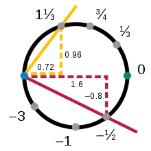 چارتهای بالایی و سمت راست، به ترتیب و در دامنهٔ خود همپوشانی دارند: اشتراک آنها در یک چهارم از دایره قرار داشته، آنجا که مختصات و مثبت هستند. هر کدام از چارتهای مذکور این بخش را به شکل متفاوتی بر روی بازهٔ مینگارند؛ لذا میتوان تابع را ساخت، به گونه ای که معکوس مقادیر هم-دامنهٔ را به دایره برمیگرداند، سپس نگاشت آن قسمت از دایره را به بازه برمیگرداند. فرض کنید a یک عدد دلخواه در بازه باشد: