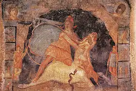 - David Ulansey, The origins of the Mithraic mysteries, p. 6: "Although the iconography of the cult varied a great deal from temple to temple, there is one element of the cult’s iconography which was present in essentially the same form in every mithraeum and which, moreover, was clearly of the utmost importance to the cult’s ideology; namely the so-called tauroctony, or bull-slaying scene, in which the god Mithras, accompanied by a series of other figures, is depicted in the act of killing the bull."