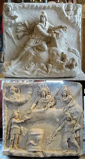Often, the mithraeum was embellished elsewhere with secondary exemplars of the tauroctony, and there also seem to have been small portable versions, perhaps for private devotion.