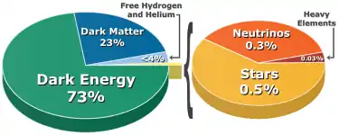 اینگونه پنداشته میشود که فشار منفی از ویژگیهای انرژی خلاء است، اما ماهیت دقیق و وجود انرژی تاریک همچنان به عنوان یکی از رازهای مهبانگ باقی ماندهاست. نتایج منتشر شده توسط تیم دبلیومپ در سال ۲۰۰۸، جهانی را توصیف میکنند که شامل ۷۳٪ انرژی تاریک، ۲۳٪ ماده تاریک، ۴٫۶٪ ماده و معمولی و کمتر از ۱٪ نوترینو است.[34] بنا بر نظریات، چگالی انرژی در ماده با انبساط کیهان کاهش مییابد اما چگالی انرژی تاریک ثابت است (یا تقریباً ثابت است). بنابراین در گذشته ماده بخش بزرگتری از کل انرژی جهان را در مقایسه با زمان حال تشکیل میداد و اما همچنانکه سلطه انرژی تاریک در آینده دور افزایش مییابد، سهم ماده در انرژی کل جهان کاهش خواهد یافت.