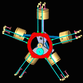 از آنجا که زاویه حرکت شاتونها دارای همپوشانی است نمیتوان تمام سیلندرها را مستقیماً به میل لنگ متصل کرد. تلاشهای زیادی در جهت حل این مسئله انجام شد از قبیل استفاده از اتصالات چنگال شکل (شیار دار)، اما هیچیک به نتیجه مطلوب نرسید. در این گونه موتورها مجموعه پیستونها توسط مکانیزم شاتون-اصلی-فرعی به میل لنگ متصل گشته به این شکل که شاتون اصلی (بالاترین پیستون در داخل تصویر متحرک) دارای اتصال مستقیم به میل لنگ میباشد، و پیستونهای دیگر به حلقه ای وصل میشوند که به شاتون اصلی متصل است.