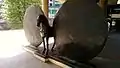 A public sculpture situated outside of the Museum of London; created by Christopher Le Brun (1951–), it is titled "Union: Horse with Two Disks".