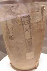 Painted pottery of neolithic Yangshao culture, with depiction of a stork catching a fish and a stone axe on the side