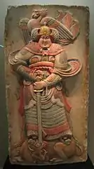 Painted stone relief depicting a warrior from the Later Liang Dynasty