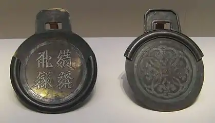 Bronze two-part pass (paizi) with a four character Tangut inscription inlaid in silver, from the Western Xia