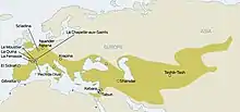 ![]() نقشهٔ توزیع انسان نئاندرتال و سایتهای اصلی. صنایع موستری خارج از این محدوده یافت شدهاند