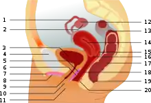 ![]() Drawing of the female internal sexual anatomy. The G-spot (6) is reportedly located ۵–۸ سانتیمتر (۲–۳ اینچ) into the vagina, at the side of the urethra (9) and the urinary bladder (3). |