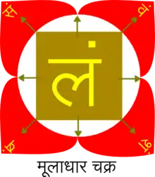 نماد آن با یک نیلوفر آبی قرمز، چهار شاخه دار و یک مربع زرد در مرکز آن قرار دارد. هر گلبرگ یکی از سانسکریت هجا वं VAM، शं سام، षं سام، و सं سام بر روی آن با طلا نوشته شدهاست، به نمایندگی از چهار vrittis: بزرگترین شادی، لذت طبیعی، لذت در کنترل شور و سعادت در غلظت. یا ممکن است نشان دهنده دارما (اشتیاق روانی معنوی)، artha (اشتیاق روانی)، کاما (اشتیاق فیزیکی) و به moksha (اشتیاق برای رهایی معنوی).[3] هشت نیزه از کنارهها و گوشههای مربع نشان میدهد.
