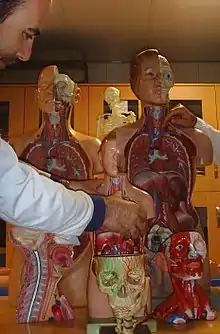 بیشتر اوقات به منظورِ آموزشِ درسِ عملیِ کالبدشناسی (آناتومی)، دانشجویانِ رشتۀ پزشکی، دندانپزشکی، پرستاری، مامایی و دیگر رشتههای پیراپزشکی و مهندسی پزشکی در سالن مولاژ[5] از مولاژهای کالبدشناسی استفاده میکنند .