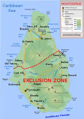 ![]() Topographic map of Montserrat showing the "exclusion zone" due to volcanic activity, and the new airport in the north. The roads and settlements in the exclusion zone have mostly been destroyed. | |