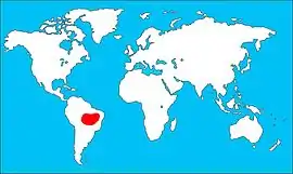 | ناحیه قرمز رنگ پراکندگی طوطی مکائو سنبلی در جهان | |