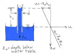 اگر یک لولهٔ مویینه را در ظرف آب قرار دهیم، در اثر وجود نیروی کشش سطحی، سطح آب در داخل لولهٔ مویینه بالاتر از سطح آزاد قرار میگیرد؛ به همین ترتیب آبی که در خاک وجود دارد در فضای حفرههای خاک نفوذ میکند و از سطح آزاد آب بالاتر میرود. در واقع، ممکن است خاکی که در فاصلهای بالاتر از سطح آب زیرزمینی قرار دارد در اثر همین پدیده، به صورت موضعی اشباع شود. هرچه در ارتفاع خاک بالاتر رویم از میزان رطوبت خاک کاسته میشود. اگر آبی که در فضاهای مویینهٔ خاک وجود دارد حرکت نکند از قانون فشار آب در حالت ایستایی، پیروی میکند؛ البته باید توجه داشت که در فاصلههای بالای سطح آزاد آب منفی در نظر گرفته میشود؛ بنابراین فشار ایستایی آب در بالای سطح آزاد آن منفی است. ضخامت ناحیهای که در اثر مویینگی اشباع شده بسته به اندازهٔ فضاهای خالی موجود در خاک دارد (اندازهٔ حفرههای موجود درخاک) اما معمولاً ضخامت این ناحیه حدود چند سانتیمتر برای ماسه و چند ده متر برای لای و رس است.[4]