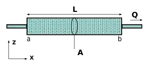 خروجی کل (حجم در یکای زمان برای نمونه: ft³/s یا m³/s) متناسب است با نفوذپذیری، ، مساحت مقطع عرضی، و نرخ تغییر فشار آب حفرهای با فاصله، ، و نسبت عکس با لزجت دینامیک مایع، . حضور علامت منفی به این دلیل است جریان مایع از فشار بیشتر به سمت فشار کمتر است؛ بنابراین اگر تغییر فشار کوچکتر از صفر یا منفی باشد (در جهت )، جریان بزرگتر از صفر یا مثبت خواهد بود (در جهت ). معادلهٔ بالا برای یک لوله افقی به خوبی جواب میدهد اما اگر لوله، مایل باشد، نقطهٔ b بلندی متفاوت از بلندی نقطهٔ a خواهد داشت و معادله، دیگر درست کار نخواهد کرد. تأثیر اختلاف بلندی دو طرف لوله در جایی که اختلاف فشار آب حفرهای زیادی،، محاسبه میشود، در نظر گرفته میشود که عبارت است از: