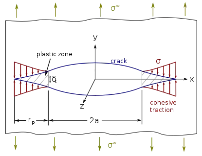 وقتی ناحیه قابل توجهی در اطراف نوک ترک دچار تغییر شکل پلاستیک شده است، می توان از روشهای دیگری برای تعیین احتمال گسترش بیشتر ترک و جهت رشد و انشعاب ترک استفاده کرد. یک تکنیک ساده که به راحتی در محاسبات عددی گنجانده می شود ، روش مدل منطقه منسجم است که مبتنی بر مفاهیمی است که به طور مستقل توسط بارنبلات (Barenblatt)[29] و داگدیل (Dugdale)[30] در اوایل دهه 1960 پیشنهاد شده است. رابطه بین مدل های داگدیل-بارنبلات و نظریه گریفیت (Griffith's theory) اولین بار توسط ویلیس (Willis) در سال 1967 مورد بحث قرار گرفت.[31] برابری دو روش در زمینه شکستگی شکننده توسط رایس در سال 1968 نشان داده شد.[25]