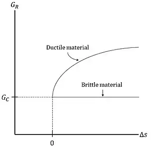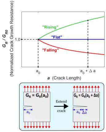 علاوه بر این، با رشد ترک در بدنه مواد، مقاومت مواد در برابر شکست افزایش مییابد (یا ثابت میماند).[14] مقاومت در برابر شکست میتواند با ضریب آزادسازی انرژی مورد نیاز برای انتشار یک ترک ، که تابعی از طول ترک است به هندسه و ریزساختار مواد وابسته باشد. طرح در مقابل به عنوان منحنی مقاومت نامیده میشود.[14]