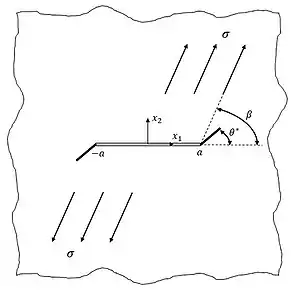 جایی که و با توجه به یک سیستم مختصات قطبی که در نوک ترک اصلی قرار دارد، تعیین می شوند.[16] جهت گسترش ترک و پوشش شکست (طرح ) با رعایت معیارهای تعیین شده تعیین می شوند. برای بارگذاری خالص حالت دوم (mode-II) به صورت محاسبه شده است.[16]