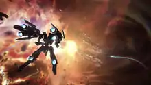 استرایک سوت زیرو، یک بازی ویدئویی در سبک جنگ فضایی که طراحی از سبک مکا را نشان میدهد.