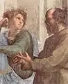 اِقلیدس" در گوشه سمت راستِ این دیوارنگاره در حال ترسیم اشکال هندسی بهروی تخته سیاه است و شاگردانش گرد او جمع شدند. در بالای سر این جمعیت"اِفلوطین" آخرین فیلسوف متأثر از تمدن یونان نیز آرام و دستبهسینه با ردایی سرخ گوشهای ایستادهاست و نظاره میکند.