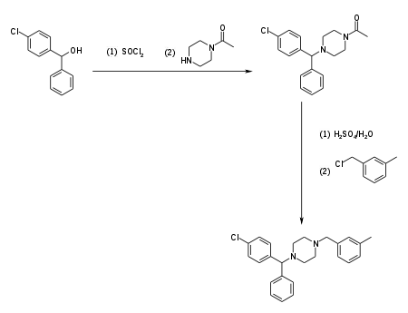 (۴-کلرفنیل)-فنیلمتانول قبل از افزودن استیلپیپرازین با تیونیل کلراید هالوژنه میشود. سپس گروه استیل با سولفوریک اسید رقیق شکسته میشود . N-آلکیلاسیون حلقه پیپرازین با ۳-متیلبنزیلکلراید سنتز را کامل میکند.