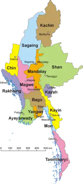 کشور برمه به هفت ایالت و هفت ناحیه تقسیم شدهاست. ناحیهها مناطقی هستند که بیشتر ساکنانشان را مردم قوم بامار (قوم اکثریت در برمه) تشکیل میدهند. ایالتها در میانمار بهطور معمول ناحیههایی هستند که منطقه سکونت یک قوم مشخص اقلیت را شامل میشوند.[13]