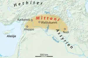 ![]() قلمرو پادشاهی میتانی در ۱۴۰۰ پیش از میلاد. | |