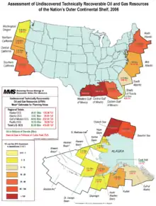 سازمان مدیریت خدمات مواد معدنی آمریکا (ام.ام.اس) در سال ۲۰۰۸ اعلام کرد که منابع نفتی در بخش بیرونی فلات قارهٔ آمریکا، بین ۶۶٫۶ تا ۱۱۵٫۱ میلیارد بشکه تخمین زده شد، که این عدد با برآورد متوسط، رقمی در حدود ۸۵٫۹ میلیارد بشکه میباشد.
