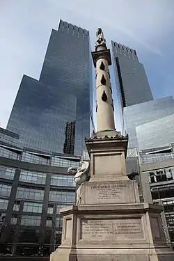 تندیس کریستف کلمب در وسط میدان کلمبوس و پس زمینهای از تایم وارنر سنتر