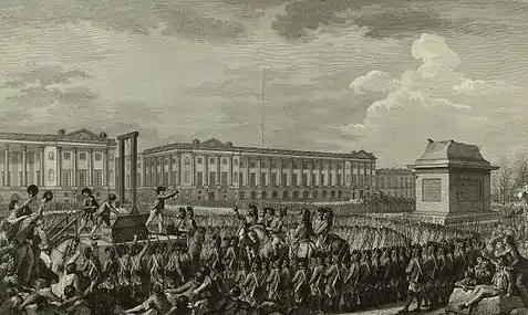 ![]() میدان کنکورد seen از Pont de la Concorde; در جلو, the Obelisk, پشت, the Rue Royale و the Church of the Madeleine; در سمت چپ, the Hôtel de Crillon. | |