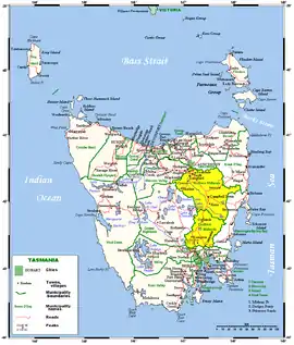 ![]() Map of the Midlands region of تاسمانی, shaded in yellow. | |||||||||||||||