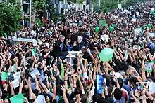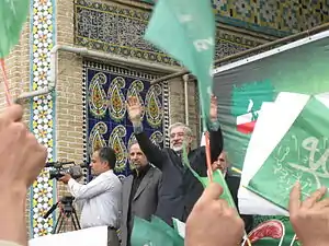 - در سالگرد دوم خرداد میرحسین موسوی در اصفهان و محمد خاتمی (حامی وی) در اجتماع بیست هزار نفره در استادیوم آزادی سخنرانی کردند.[15] هنرمندان سرشناس، کارگردانان سینما، هنرپیشگان، سیاستمداران و هزاران دانشجو و جوان در در حمایت از موسوی به این استادیوم رفته بودند. بسیاری از طرفداران موسوی با در دست داشتن پوسترهای او، لباسهایی به رنگ سبز بر تن داشتند یا بازوبند سبز بسته بودند. صدها پرچم سبز رنگ نیز در دست طرفداران موسوی بود. پوشش به رنگ سبز را ستاد انتخاباتی موسوی برای حامیان او به عنوان نمادی از آیین اسلام و پیشرفت ایران در نظر گرفتهاند.[16] از جمله افراد شرکتکننده و حامی موسوی در این مراسم، پدر محمد جهانآرا و همسر محمدعلی رجایی (عاتقه صدیقی) را میتوان نام برد. همچنین از سینماگران، لیلی رشیدی و حمید فرخنژاد در آن حضور داشتند.[17]