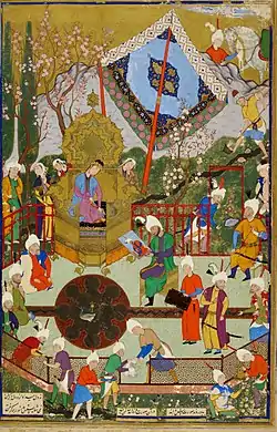 نواهایی بدین سان رامشانگیز، همی زد باربد در بزم پرویز/ خسرو به بربت باربد گوش میدهد، نگارهای از میرزا علی. پنج گنج نظامی. ۱۵۳۹تا۴۳م، کتابخانهٔ بریتانیا.[8]