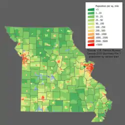 ایالت میزوری دو شهر بزرگ دارد: یکی سنت لوئیس و دیگری کانزاس سیتی که هر دو بالای دو میلیون نفر جمعیت دارند. چند شهر دیگر نیز در ایالت وجود دارند که در مقیاس شهرهای متوسط محسوب میگردند. در این گروه میتوان جفرسون سیتی (پایتخت ایالت)، اسپرینگفیلد، کلمبیا، سنت جوزف و جاپلین نام برد.