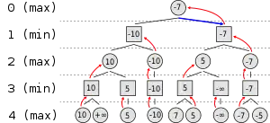 درخت از یک تابع اکتشافی استفاده میکند. حرکتهایی که به برد بازیکن با مقدار حداکثر منجر میشود با مثبت بینهایت مشخص شدهاند و حرکتهایی که باعث برد بازیکن با مقدار حداقل میشود با منفی بینهایت نشان داده شدهاست. برای مثال در سطر ۳ مقدار هر گره برابر مینیمم مقادیر فرزندان آن گره خواهد بود. برای مثال سمت چپترین گره در سطر سوم باید مینیمم بین ۱۰ و مثبت بینهایت را به عنوان مقدار خود انتخاب کند بنابراین مقدار این گره ۱۰ خواهد شد.