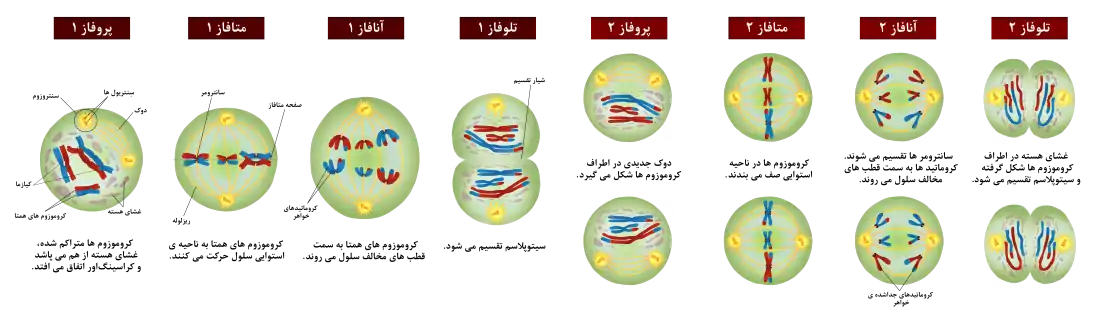 میوز از دو تقسیم پیاپی هستهٔ سلول به نام میوز ۱ و میوز ۲ تشکیل شدهاست که هر کدام خود مراحل پروفاز، متافاز، آنافاز و تلوفاز را دارند. میوز ۲ بسیار شبیه میتوز است. طولانیترین مرحلهٔ میوز، پروفاز ۱ است.
