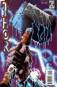 ![]() Mjolnir held by Thor Odinson on the cover of Thor #494 (Jan. 1996). Art by Mike Deodato Jr. | |