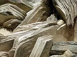 میکا گروهی از ورقهای سیلیکات کانی با داشتن درجه کاملی از رخ است.[5] ترکیبات این کانی تشکیل شده از یک سیلیکات آبدار آلومینیوم به همراه پتاسیم یا سدیم است که دارای اشکال گوناگونی میباشد. ترکیبات سنگ میکا از اکسیژن و سیلیسیم و آلومینیوم و پتاسیم و مقداری ناخالصی دیگر است.[6] میکا ها حدود 4% از کانی ها را تشکیل می دهد.