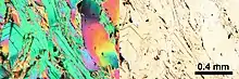 Photomicrographs of a thin section containing phlogopite. In cross-polarized light on left, plane-polarized light on right.