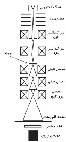 اولین تصویر که توسط عدسیهای شیئی ایجاد میشود، معمولاً از بزرگنمایی ۱۰۰–۵۰ برابر برخوردار است. این تصویر توسط یک سری از عدسیهای میانی و تصویری بزرگ شده و نهایتاً بر روی صفحه نمایش فلوئورسانس میکروسکوپ تابانده میشود. با استفاده از سه یا چهار سری عدسی، که هر سری میتواند تا بیست برابر تصویر را بزرگ کند، به راحتی، بزرگنمایی نهایی تا حدود یک میلیون قابل دستیابی خواهد بود. برای بزرگنمایی کمتر نیازی به استفاده از تمام عدسیها نیست، لذا میتوان یک یا تعداد بیشتری از عدسیهای تصویر را خاموش کرد.