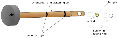 محفظه نمونه یکی از قسمتهای بسیار مهم میکروسکوپ است که در زیر قسمت سیستم متمرکزکننده قرار دارد. باید نمونههای بسیار کوچک بهطور بسیار دقیقی در جای مناسب خود در داخل عدسیهای شیئی قرار گیرد. اما همین نمونه باید بتواند در حد چند میلیمتر جابهجا شده و به میزان زیادی بچرخد. علاوه بر این، اگر از میکروسکوپ برای آنالیز شیمیایی نیز استفاده شود، پرتو X باید بتواند از این محل خارج شود. برای دستیابی به این مشخصات از میله نگهدارنده نمونه استفاده میشود که میتواند نمونهای به قطر ۳ میلیمتر یا کوچکتر را که بر روی شبکه حمایتی با اندازه ۳ میلیمتر قرار دارد، بین قطبهای عدسیهای شیئی قرار دهد.