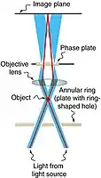 وقتی که نور از کندانسور عبور نموده و به شیئی برخورد نماید در آن صورت به دلیل پدیده تفرق حاصله در اثر جسم طیف تفرق یافته در پشت عدسی چشمی حاصل میشود. با توجه به آنکه جسم مثل یک شبکه متفرقکننده عمل مینماید در آن صورت تصویر در این شبکه در اثر تفرق در پشت عدسی چشمی ایجاد میشود. تصویر حاصله که نشان دهنده جزئیات جسم است در اثر ترکیب نور متفرق شده و نور عبور نموده بدون تفرق ایجاد میشود. به علت آنکه بین نور متفرق شده و نور عبور نموده بدون تفرق ایجاد میشود. به علت آنکه بین نور متفرق شده و نور مستقیم اختلاف فاز وجود دارد لذا این دو نوع پرتو با همدیگر ترکیب شده و تداخل انجام میشود و در نتیجه اختلاف فاز این دو نوع نوز ایجاد تغییر در دامنه یا شدت نور در صفحه تصویر مینماید. میکروسکوپهای فاز – کنتراست بگونهای طراحی شدهاند که تغییر فاز حاصله در اثر وجود نمونه و تغییر فاز در اثر تغییر ضریب شکست در اجزاء مختلف آن این تغییر فاز به تغییر شدت تبدیل شود.