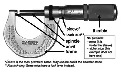 - شناسایی موقعیت خطی صفر استوانه یا غلاف متحرک میکرومتر که در امتداد خط صفر استوانه ثابت قرار گرفتهاست و ضرب تعداد آن به ۰٫۰۱ میلیمتر میباشد.