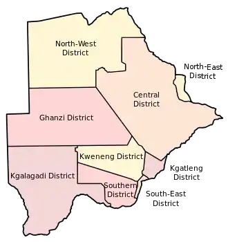 کشور بوتسوانا به ۱۶ ناحیه اداری تقسیم شده است که عبارتند از: ۹ ناحیه روستایی و ۷ ناحیه شهری. این ۱۶ ناحیه توسط ۱۵ شورای محلی اداره میشود.[1][2]