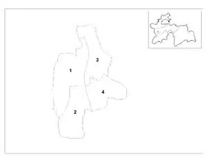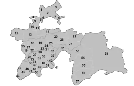 | ۱۹ | ناحیه وحدت | Ваҳдат | ینگیبازار (۱۹۲۷–۱۹۳۶)، ارجونیکیدزهآباد (۱۹۳۶–۱۹۹۲)، کافرنهان (۱۹۹۲–۲۰۰۳)[5] |