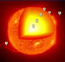 در پائین «ناحیه تابشی» چگالی ۲۲ گرم بر سانتیمتر مکعب است و درجه حرارت ۸٫۰۰۰٫۰۰۰ کلوین. در بالای این ناحیه چگالی به ۰٫۲ گرم بر سانتیمتر مکعب میرسد و حرارت تا ۲٫۰۰۰٫۰۰۰ کلوین کاهش مییابد.
