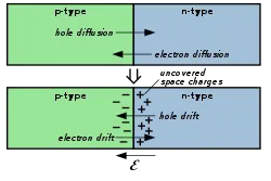 پس از نفوذ الکترون به ناحیه p، این الکترون با یکی از حفرههای موجود در طرف p، بازترکیب (خنثی) میشود. این فرایند در مورد حفرههای نفوذ کرده به ناحیه n نیز صادق است. همانطور که در بالا اشاره شد، هر الکترون و حفره نفوذ کرده به سمت مقابل، یک یون باردار در نزدیکی مرز نیمه هادی n و p بر جای میگذارد. این یونها دارای بار مثبت در طرف نیمه هادی n و بار منفی در طرف نیمه هادی p هستند و به علت جرم بسیار بالا نسبت به الکترون و حفره (هسته اتم هزاران بار سنگین تر از الکترون است)، نمیتوانند حرکت کرده و یکدیگر را خنثی سازند و در نتیجه یک ناحیه با بارهای مثبت و منفی جدا از هم و در کنار هم به وجود میآید. این حالت سبب تشکیل یک میدان الکتریکی در این ناحیه (ناحیه تخلیه) میشود. این میدان الکتریکی از ادامه نفوذ الکترونها و حفرهها به طرف مقابل جلوگیری میکند. جهت این میدان الکتریکی از سمت ناحیه n به سمت ناحیه p است. در لحظهای که شدت میدان الکتریکی به اندازهای برسد که نفوذ الکترونها و حفرهها را متوقف کند، حالت تعادل به وجود میآید و به ولتاژ به وجود آمده در دو سر لایه سد (ناحیه تخلیه)، ولتاژ اتصال یا پتانسیل سد گفته میشود. (این ولتاژ در دیود سیلیسیوم معمولی حدود ۰٫۷ ولت است)