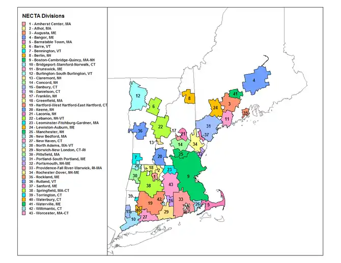 - مشارکتکنندگان ویکیپدیا. «New England city and town area». در دانشنامهٔ ویکیپدیای انگلیسی، بازبینیشده در ۱۵ فوریه ۲۰۱۵.