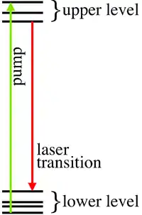 یک مدل جهانی معتبر برای همه نوع لیزر وجود ندارد.[8] سادهترین مدل شامل دو سیستم زیر سطحی است: سطح بالا و پایین. در هر یک از زیر سطحها، انتقال سریع برای حصول اطمینان از رسیدن سیستم به تعادل حرارتی صورت میپذیرد که از توزیع آماری ماکسول-بولتزمن هم چنین بر میآید. (شکل ۱). فرض میشود که سطح بالا نیمه پایدار است.