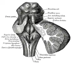 ![]() Rhomboid fossa. (Area postrema labeled at bottom center.) | |